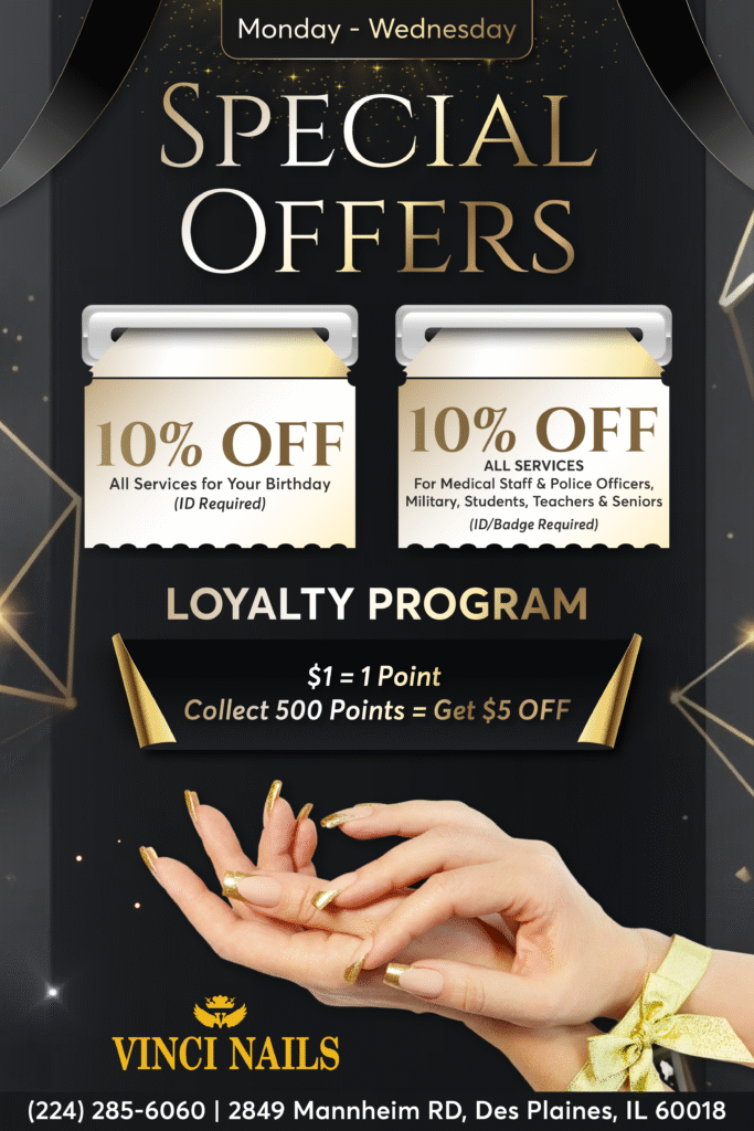 Welcome to Vinci Nails – your go-to nail haven in Des Plaines! Located at 2849 Mannheim RD, Des Plaines, IL 60018, we specialize in stylish manicures, relaxing pedicures, acrylics, dips, gels, and all the trendiest nail designs. Walk in or book today, and let your nails do the talking!